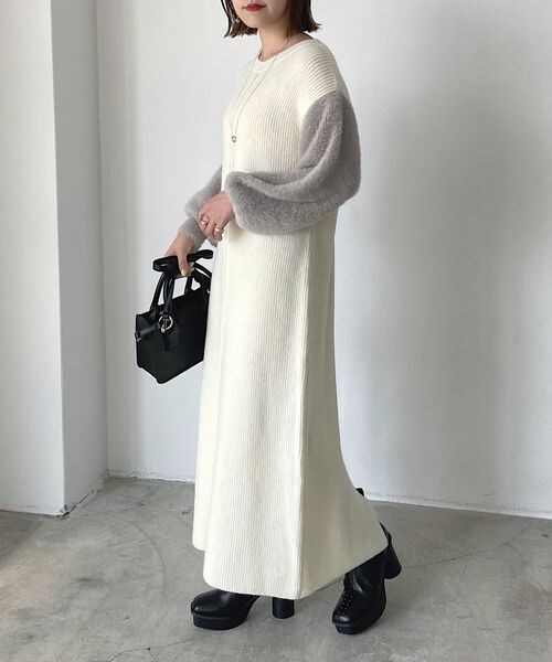 ーーー 身頃と袖の異素材使いがポイントのロングニットワンピース ふっくらと編立てた暖かみのある片畦のボディに、毛足のあるシャギーニットの袖をドッキング。 体のラインを拾わない程よいゆとりのロングシルエットに裾にはバックスリット入りで、ロング丈ですが足裁きが良く動きやすさも◎ ふっくらと立体感のある袖に長めのリブでレディライクな雰囲気に仕上げました。 シンプルながらも一枚でスタイリングが決まるデザインワンピ。 ーーー 合わせる小物やシューズでがらっと雰囲気を変えられるもの◎ 〈注意事項〉 ・サンプルにて撮影をしておりますので、実際の商品とは素材や仕様・加工・サイズ等が若干異なる場合がございます。 ・モニター・環境等により実際の商品と色味が多少異なって表示される場合がございます。予めご了承をお願いいたします。 ・撮影環境により、光の当たり具合で色味が違って見える場合があります。あらかじめご了承下さい。