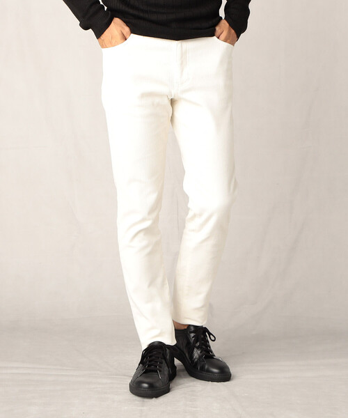 《素材》 立体感のある14ウェル(1インチに14本の畝)ストレッチコーデュロイを使用しています。 ゆっくり丁寧に織り上げ、エアータンブラー加工を施しソフトでふくらみのある風合いに仕上げました。 温かみのある穿き心地の良い素材です。 《デザイン》 ウェスト周りに若干ゆとりを持たせ、裾に向けて絞ったコムサメン定番のテーパードシルエット。 野暮ったい印象を極力なくした細めの畝は上品な印象でジャケット等とのコーディネイトにも好相性です。