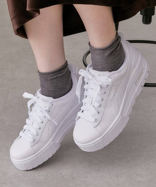大人気の厚底スニーカー『MAYZE (メイズ)』をさらに女性らしいフェミニンなデザインにアップデートしたメイズウェッジスニーカー。つま先からかかと部分にかけて傾斜していき、脚長効果をもたらすウェッジソールは健在。女性らしいフェミニンな雰囲気を演出しながらアクティブなコーディネートにもマッチするデザインに仕上げました。アッパーのレザーには柔らかな質感のタンブルレザーを使用し、軽量感、着用時の快適性、機能性にも優れたおすすめの一足です。クラシックなスニーカーが大胆にイメージチェンジを遂げた超厚底ソールがこれまでになくホット。一発で大胆不敵さを加え、スタイルの新たな高見へと誘うアイテムです。(386273)【ブランド】PUMA(プーマ)プーマは、ドイツヘルツォーゲンアウラッハを本拠地とする世界的なスポーツブランド。スポーツ用品からシューズ、スポーツウェア、ファッションアイテムなど幅広いジャンルで製造から販売までしている。近年ハイファッションとのコラボレーションを積極的に行う。▼商品のお気に入り登録完売カラーの再入荷通知やセール情報を受け取ることができます。▼PALCLOSETアプリにてブランドフォロー新商品や再入荷等、いち早くブランドのお得な情報を受け取ることができます。※掲載画像の商品の色味は、屋内の光の照射や角度により実物と色味が異なる場合がございます。予めご了承ください。