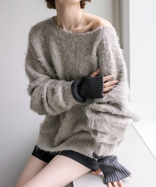 2WAY仕様の着回し抜群ニット商品ポイント・Vネックとクルーネック、前後両前で着れるふわふわ素材のニット。・ボリューム感のある袖口で女性らしく決まります。・広めのネック部分でデコルテをすっきり見せて、抜け感のある印象に◎・片方を肩落ちさせ、ワンショルニットとしても着ていただけます。スタイリングポイント・トレンドのミニ丈ボトムやパンツ合わせでバランスよく着ていただけます。・パンツスタイルには前だけインしていただくのもおすすめ◎※洗濯、取り扱い洗濯:家庭洗濯NGアイロン:低温110℃まで スチームなし(あて布使用)タンブル乾燥:不可------------------------------------------------------裏地:なし伸縮性:あり光沢感:なし生地の厚さ:ややあつめ------------------------------------------------------------------------------------------------------------商品のお気に入り登録➡ お気に入りアイテムの値下げ・再入荷・在庫1点などの通知を受け取ることができます。ブランドのお気に入り登録➡ 新商品や再入荷、セール、クーポン配布などお得な情報を受け取ることができます。※サイト上のカラー名と、お届け商品に記載されているカラー名が異なる場合がございます。※商品の色味は、撮影場所や光のあたり具合などにより色味が違って見える場合が御座います 。また、お客様のお使いのPCのモニター環境などにより色味が違って見える場合が御座います。予めご了承の上ご注文下さい。※ご注文いただいた予約商品のお届け時期の確認は、注文履歴ページより行えます。------------------------------------------------------