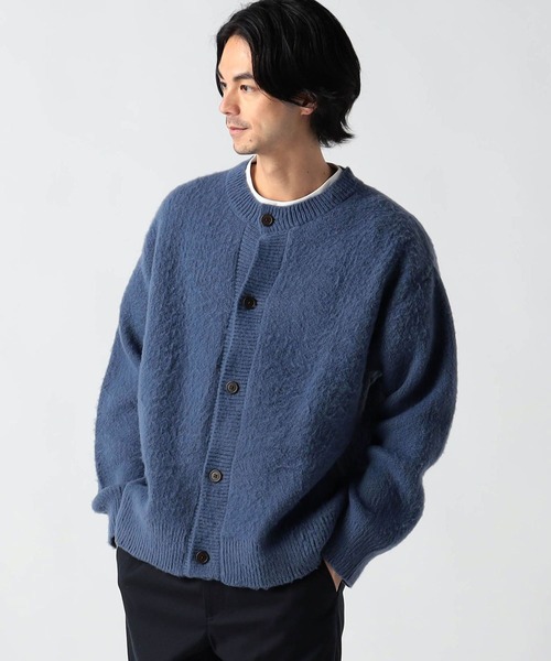 独特の表面感と起毛が特徴のボリューム感のあるシャギーニットは、重厚感のある見た目ながらもポリエステル糸を使用する事で軽くしながらも、防寒性も高めています。インナーで着ても1枚で着てもインパクトのあるニットです。 ・シルエット ニット特有のボリューム感と程よくゆとりのあるサイズ感でスウェットにはない素材感とシルエットになっています。 釦を開けた感じと閉めたのとシルエットの変化が出るのも特徴です。 ・ファブリック 表面を起毛加工して肌触りが良く、ニット特有のやわらかい印象になるシャギーニットを使用しています。 もこもこしていて温かみがありウールのような見た目ながらもポリエステル糸の軽さ、手洗い選択できるケアのしやすさなどが特徴です。 ・スタイリング ボリュームがあるので1枚で着てもインパクトのあるスタイリングになります。 インナーにスウェットやパーカーを合わせてアウターのように着用するのもおすすめです。 パンツはワイドでもテーパードでもどちらでも合わせやすいボリューム感です。 ※ご家庭でのお洗濯可能な商品です。詳細、取り扱い方法は商品に付いている品質表示、アテンションタグをを御確認下さい。 ***************** 裏地:なし 伸縮性:あり 光沢感:なし 生地の厚さ:ふつう 透け:なし ***************** <スタッフ着用コメント>本社 Hさん身長:178cm/体重:66kg/体型:普通/普段サイズ:48(L)/着用サイズ:48(L) サイズ感:ゆったりとしていて着やすい 素材感:程良い厚みで温かみを感じられる。伸縮性があって着やすい。 着心地:やや厚みがあるが見た目以上に軽い。