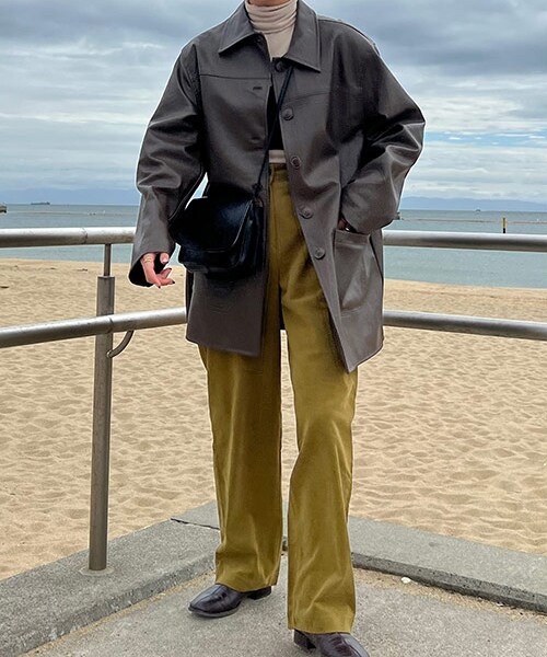 秋冬のマストアイテム、コーデュロイパンツです?ややワイドなシルエットで楽に着用できつつ、しっかり脚をきれいに見せてくれるシルエットです!コーデュロイのアイテムを取り入れるだけで一気に季節に合ったスタイルに仕上がります!写真のようなレザージャケット合わせやトレーナーと合わせたカジュアルなスタイリングがおすすめです!着用カラー:オリーブ 着用サイズ:Sサイズ