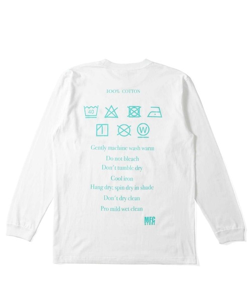 洗濯の表示タグをモチーフにしたデザイン。フロントはウェットクリーニングの表記を再構築。男女問わず着用しやすい一着。