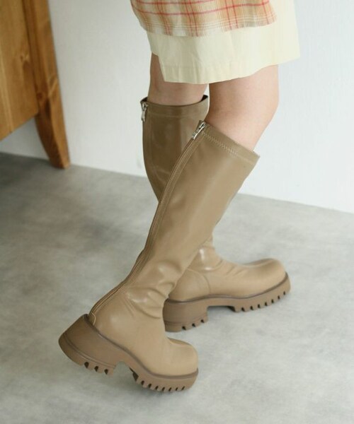 今季トレンドのロングブーツ。 ボリューム感のある厚底のトラックソールでスタイルアップ効果が叶います。 程よいフィット感ですっきりとした印象に。 ストレッチの効いた柔らかな素材でストレスフリーに履いていただけます。 ハーフパンツを合わせたスタイリングがトレンド感がありおすすめです。 スキニーなどの細身のパンツをブーツインするのも◎ この時期に活躍のマストハブアイテムです。