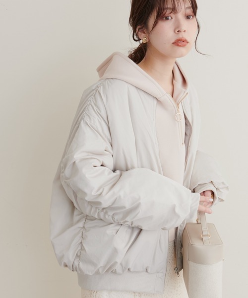 【2022AW natural couture】 上品さを兼ね備えた大人カジュアルなブルゾン ■Design 袖にたっぷりとボリュームのあるMA-1。 クリアな表面感と抑えめの光沢感でハリコシのある風合いが特徴です。 きれいめコーデにも合わせやすく、普段カジュアルアイテムを着ない方でも取り入れやすい1枚となっております。 ビッグシルエットでこなれたスタイルが完成するアイテムです。 ■Styling デニムなどのカジュアルなアイテムと相性抜群なのはもちろん、リブニットワンピースなどに羽織ると大人っぽさ漂うこなれたスタイリングに仕上がります。 カジュアルにもきれいめにも着回せる、今シーズン手に入れたいマストアウターです。 ■Fabric さらりとした表面感のスポーティな素材。中綿入りで暖かさも抜群です。 カラーはアイボリー、グレージュ、ブラックの3色をご用意しております。 ========================= 透け感:なし 裏地:あり 伸縮性:なし 光沢感:あり 生地感:ハリコシのある表面感に中綿で厚みもあり ========================= 【お気に入り登録でお得な情報がいっぱい】 ・「商品のお気に入り登録」で再入荷通知や、ラスト1点の通知、セール通知をいち早く受け取ることができます。 ・「ブランドのお気に入り登録」で新商品や再入荷など、お得な情報を受け取ることができます! ※店舗の入荷時期は商品によって異なります。 店頭の在庫状況につきましては各店舗にてお問い合わせください。 ※撮影時の光の関係で、画面上の画像と実際のお色とでは若干の色差が生じる可能性がございます。 また、ご覧いただいているモニター画面や、お使いのブラウザによっても、お色の違いがございますことをあらかじめご了承くださいませ。