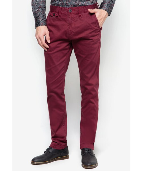 Dark Red Chino Pants by Koyo Jeans feature a minimal design with contrasting pocket trims and visible stitching details.- Cotton blend - Zip and button fastening - Four pockets - Coin pocket with flap and button closure - Regular fit