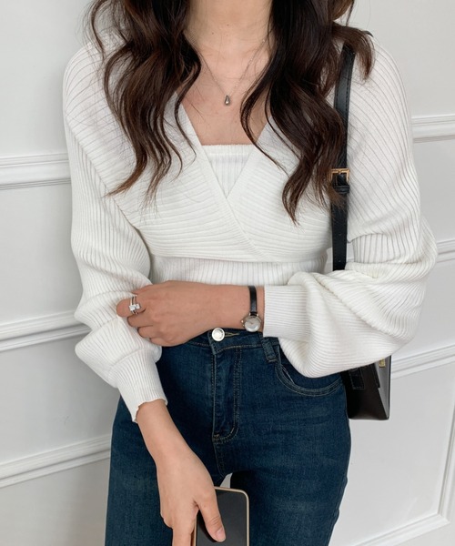 インナー風キャミリブニットにVネックをレーヤードさせたデザインのニットプルオーバー。 首元の衿ぐり広めなネックがデコルテラインを綺麗に魅せ、 360度どこから見ても美しいシルエット◎ ふんわりしたボリューム袖が女性らしいプルオーバーニット。 コンパクトな着丈でどんなボトムスとも好相性。 ■コーディネート ハイウエストボトムスと合わせるとスッキリと着ていただけます◎ デニムにアウトスタイルで合わせた可愛くなりすぎないコーデも◎ ★詳細ディテールは、下記のライブ配信でリクエスト頂くことで御確認できます。 tiktokアカウント ①「abiを作った悪魔」最新情報をチェック! ②「ENチャンネル」平日毎朝7時~9時LIVE配信でお得な情報をGET!