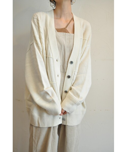 暖かみのあるミックス調ラムウール糸のカーディガン。 ケーブル編み、リブ編み、鹿の子編み、天竺編み等、様々な編地を使用し、前後ともパッチワークした手の込んだデザインです。