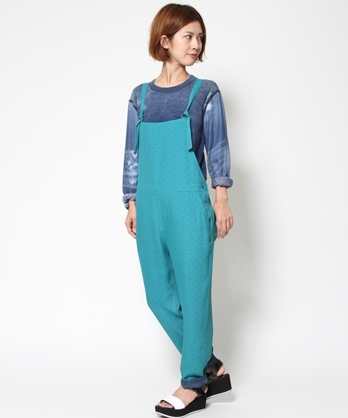 細かいドットのジャカード素材で仕立てたサロペット。 落ち感のあるレーヨンアクリルの生地は、さらりと大人っぽく着られるのが魅力。 細めのストラップをDカンに通して結ぶ仕様、大胆なバックスタイルなど、子供っぽくならないようなディテールにこだわりました。 カジュアルにカットソーを合わせても、ブラウスやニットで綺麗めにスタイリングしても◎。