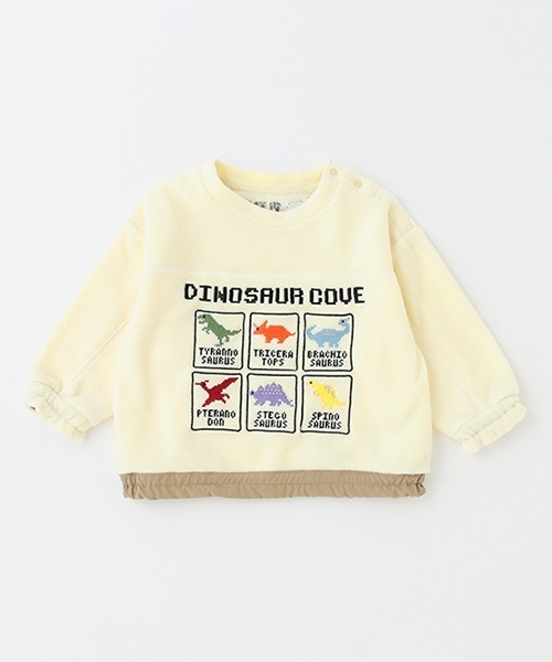 8bitで描かれたいろんな恐竜さん刺しゅうがポイントのプルオーバーです。図鑑のように恐竜の名前が書かれた遊び心満点のデザイン。後ろヨークにはブランドロゴ刺しゅうを添えてアクセントにしました。裾はポリエステル生地の切り替えをほどこし、アウトドアテイストに仕上げたおしゃれなデザインです。※90サイズのみ肩開き【透け感】透けない【生地の厚さ】普通【伸縮性】あり【裏地】なし【ポケット】なし