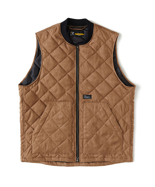 独特なタッチのフェイクスエードを使用し軽い中綿を入れたジップベスト。ワークテイストあふれるダイヤキルティングがアクセントとなり、シンプルなデザインながらも様々なコーディネートで活躍してくれるアイテム。衿リブを細めに設定することで、スウェットパーカーやネルシャツと合わせて、ネック周りにアクセントを付けたコーディネートが楽しめる。