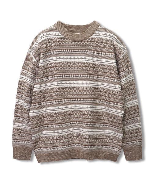 ●古着屋にありそうなレトロデザインが魅力のジャガードニット。 ●レトロな雰囲気は残しつつ、程よくオーバーサイズなのでトレンド感はしっかり。 ●裾や袖にニットがたっぷりと溜まるので、 オーバーサイズならではのダボっとした魅力的なシルエットを作ってくれます。 ●落ち着いたカラーリングと細かく優しい柄なので キレイ目のスラックスでもミリタリーなカーゴパンツでも定番のチノパンツでも、 どんなアイテムとも相性◎ ●ダボっとしたデニムやガーリーなスカートとの相性も良いので、 女性にもおすすめのアイテムです! インナーに衿レースのシャツなどを入れてもかわいいです。