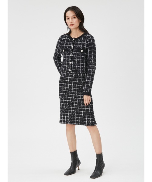 【セットアップ対応・3種類のファンシーヤーンでツイード調に編み上げたニットスカート】 【Design/Styling】 ストレッチ性のある糸で織り上げたツイードライクな表情のニットスカートは、ウエスト全周ゴム仕様で、ハイウエストにもジャストウエストにも着用いただけます。 すっきりした丈感のタイトシルエットには、裏地を縫いつけており着心地は抜群。 シンプルトップスやカジュアルなロングTシャツなども好相性で、足もとはブーツを履いて重厚感をだすとバランス良く決まります。 同素材のツイードニットミドルスカート(FWNT225204)とセットアップでの着用もおススメです。 ※照明の関係により、実際よりも色味が違って見える場合があります。 またパソコン・スマートフォンなどの環境により、若干製品と画像のカラーが異なる場合もございます。予めご了承ください。 商品の色味は、商品単品画像をご参照下さい。 ※商品画像はサンプルのため、色味やサイズ等の仕様に変更がある場合がございますので、予めご了承ください。