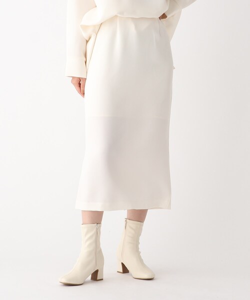 【BARFOUT!掲載】 クリーンさとイージーさを兼ね備えたナロースカート 【デザイン】 ・ミニマルなスタイルのナローロングスカート ・ウエストはインベルト使いで、表にはギャザーが響かずクリーンにこなせるデザイン ・インベルトにはゴム使いで、非常にイージーな穿き心地も魅力 ・深めのベンツ仕様で、脚捌きも楽ちん ・ロゴトップスで大人カジュアルにこなしたり、同素材のトップスとセットアップでキレイめにこなすのもおすすめ ※同素材のトップス637-85061(ダブルジョーゼット ドルマントップス)もご用意がございます。 ※ポケットなし 【素材】 ・2重織りのジョーゼット素材。ほどよくシルエットの出る厚みと、膨らみ、落ち感が魅力です ・表面はジョーゼットらしい凹凸感があります ・マシンウオッシャブル、イージーケアも魅力 ※膝丈の裏地あり ※オフホワイト(003)ベージュ(052)はやや透け感があるため、インナーの着用をおすすめします。 ※WEB限定サイズ:36(S) こちらの商品は主に冬に着用いただける商品です。 モデル情報:身長168cm B76 W58 H86 着用サイズ:38(M) 店舗へのお問い合わせ商品番号:637-75081 ●製品寸法: 36(S):W64~70cm H86cm 総丈81cm 38(M):W67~73cm H88cm 総丈82cm 40(L):W70~76cm H90cm 総丈84cm 備考: