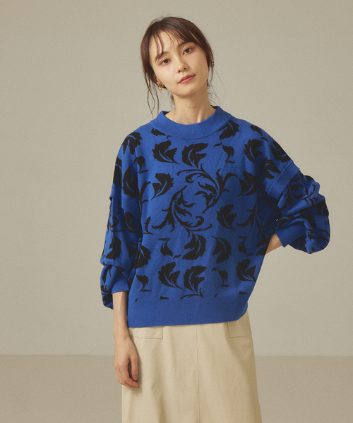 ボリューム袖がポイントのニット袖のボリューム感がポイントのニットプルオーバー。グレージュ、ブルー、ブラウンはリーフ柄でコーディネートの主役になる1枚です。ブラックはヘリンボーン柄でどんなボトムにも合わせやすいので、柄物に抵抗のある方にもオススメです◎