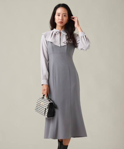 晩夏に大人気だったワンピースが長袖ver.で登場! フリルデザインが印象的な美シルエットワンピです* ■point ・1枚でおしゃれにキマるドッキングデザイン ・胸元のフリルが華やかな印象 ・自分に合ったものが選べるSMの2サイズ展開 ■detail シアー感のあるブラウスと、マーメイドシルエットのワンピースを レイヤードしたようなドッキングデザイン* 大きなフリルが顔周りを華やかに演出し、 華奢なリボンが上品な印象をプラスします。 身頃部分はコンパクトに、裾に向かって緩やかに広がる マーメイドシルエットが女性らしいラインを引き立てます♪ サイズはSとMの2サイズ展開で、 より自分に合ったものを選べるのもうれしいポイント◎ ■coordinate ロングコートを合わせると大人かわいく、 ダウンなどのショートジャケットを合わせると 少しカジュアルダウンした印象に仕上がります* 足元には定番ショートブーツはもちろん、 ローファーを合わせるとクラシカルな雰囲気に♪ ■素材 素材:【表地】ポリエステル 97%/ポリウレタン 3%【別布】ポリエステル 100% 洗濯:ご自宅でのお洗濯が出来かねますので、クリーニングショップにご相談ください。 ********** 透け感…ややあり 裏地…なし 伸縮性…なし 光沢感…なし 生地の厚さ…やや薄め ********** ※モデルMサイズ着用 ※撮影場所やお使いのモニター環境により若干お色味が異なる場合がございます。 ■商品のお気に入り登録■ ラスト1点の通知やセール通知、また完売していても再入荷時に再入荷通知を受け取ることができますので、是非ご登録ください♪ ■ブランドのお気に入り登録■ 新商品や再入荷など、お得な情報を受け取ることができます!ぜひご活用ください!