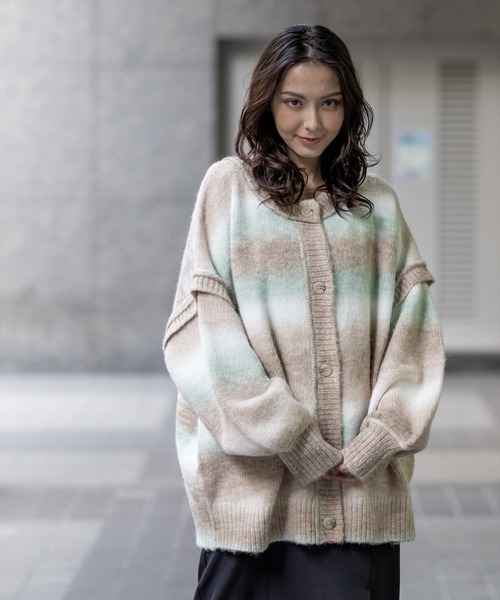 ゆったりシルエットのグラデーションボーダー2wayカーディガン 【デザイン】 グラデーションパターンが印象的なオーバーサイズのボーダーカーディガン。 前後2Wayでご着用いただけるので、着回し力も抜群。マットな質感でオシャレに抜け感を演出…♪ 【素材感】 ふっくら柔らかくて弾力のあるアクリルニット素材 伸縮性:あり / 透け感:なし / 裏地:なし / ウエストゴム:なし 手洗いによる洗濯可 / ドライ・ウェットクリーニング可 【コーディネート】 普段のコーデに軽く羽織っていただけるだけで、トレンドライクな印象に◎ ロンT(20101093196)と合わせて、後ろにボタンを何点か留めて抜け感のあるコーデに仕上げていただくのもオススメです。 【※お取り扱い上のご注意】 1:モニター環境等により実際の商品と多少色味が異なって表示される場合がございます。予めご了承下さい。 2:屋外で撮影された商品は、天候により多少実際のカラーと異なる場合があります。商品のカラーに参考される場合はトルソー(マネキン)の商品画像をご参照ください。 3:濃い色の商品は、お洗濯や摩擦等による移染にご注意ください。 4:末永くご愛用頂く為に、アテンションタグ・洗濯ネームを必ずご確認の上、着用又はお取り扱い下さい。 5:生産時期により、色、サイズ、デザイン、素材の質感が多少が異なる場合がございます。あらかじめ御了承下さいませ。