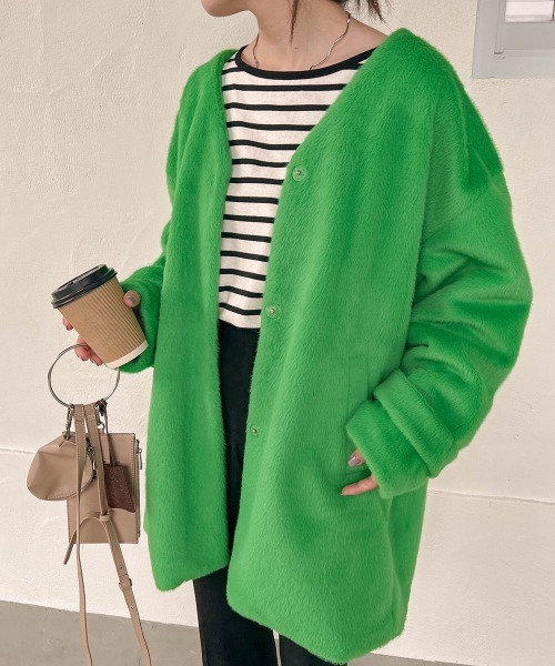 ●Bab●■POINTとても触り心地の良いエコファーを使用したコートです。カラー展開にも注目!!今年らしいヴィヴィトなグリーンから、明るい気分になれる柔らかいイエロー、ベーシックで長く愛用できるベージュまでどの色をチョイスしてもお楽しみいただけます!柔らかい素材を使っているのでカラーものでもきつく見えすぎず都会的な着こなしが完成します。形自他はベーシックで、カラーレスになっているので首周りもスッキリ。マフラーを巻いてもゴワゴワせず着用して頂けます。アームや身幅も大きめなので少し厚手のニットに合わせても◎。丈感もヒップラインが隠れるので防寒対策もばっちりです。今年1着はゲットしたいアイテム間違いなしです!■FABRIC環境にも優しいエコファーを使用。柔らかい肌触りが特徴です。毛も抜けにくいのも◎■COORDINATEシャツやワンピースと組み合わせると女性らしい上品さを残したまま着ていただけます。カジュアルにパンツに合わせても◎。シンプルなのでどんなお洋服に羽織ってもばっちりです。…………………透け感:なし裏地:あり…………………※撮影環境により、多少実際のカラーと異なる場合がございます。また、携帯やスマートフォン、パソコンなどの画面上と実物では多少色が異なって見える場合がございます。ご了承下さいませ。※画像の商品はサンプルのため、実際の商品と若干仕様が異なる場合がございます。※濃色品は、過度な摩擦や濡れた状態での摩擦により、色落ち・色移りをする恐れがあります。※この商品は、素材の特性上、洗濯の際に多少の縮みが生じる恐れがあります。洗濯後は形を整えてから干してください。※その他お取り扱いに関しましては、商品に付属のアテンションタグをご覧ください。★商品のお気に入り登録再入荷やラスト1点のお知らせ、セール情報などお知らせを受け取ることができます!★ブランドのお気に入り登録新商品や再入荷などのお得な情報を受け取ることができますので、是非ご登録ください。★Bab公式Instagramアカウント【bab.showroom】で最新情報をチェック!