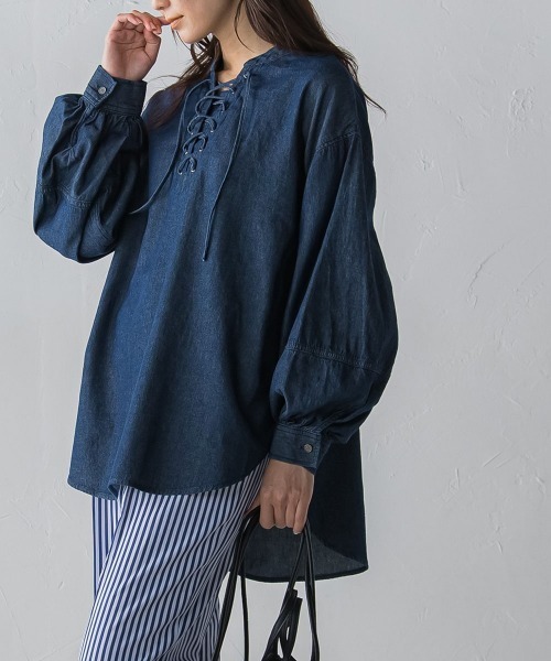 カジュアルの中に女っぽさも兼ね備えたデニムブラウス。 たっぷりのギャザーと切り替えで構築されたボリュームスリーブ、顔周り華やかなレースアップデザインの洒落度高いアイテム。 ゆとりあるサイズ感で気を張らずリラックスして着用頂けます。 細身パンツ合わせでもバランスの良い着丈とボリュームに仕上げました。 【素材の特徴】 薄手で柔らかく、適度なハリ感と着心地の良さを兼ね備えた6.5ozデニム生地を使用。 コットン100%のデニムだから着るたびに体に馴染む素材。 【レースアップ部分の紐の長さ】 ネイビーが正しい長さになります。 ---------------------------------- 洗濯方法 家庭洗濯:液温は40℃を限度とし、洗濯機で弱い洗濯ができる。 自然乾燥:日蔭の吊り干しがよい。 アイロン:底面温度150℃を限度としてアイロン仕上げができる。 ドライクリーニング:石油系溶剤による弱いドライクリーニングができる。 ---------------------------------- ■モデル身長 166cm/着用サイズ M ※画像の商品はサンプルとなりますので実際の商品と仕様、加工、サイズが若干異なる場合がございます。 ※お客様のモニター環境により実際のお色と多少異なる場合がございます。 ※撮影状況や光の当たり具合により、色合いが異なって見える場合がございます。 【socolla】 Just the way she is... 特別なサプライズがなくても、遠くへ旅行しなくても 彼女の日常シーンが輝けるように。 リラックスムードのなかに、今どき感と女性らしさのあるワンマイルウエア。 大人の女性に似合う、アメリカン・カジュアルをベースにしたプレイフルなアイテムを提案。