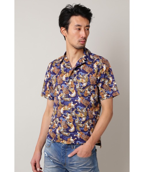 <DESIGN>表面は光沢のあるポリサテン地を使用したアロハシャツ。50年代のアロハシャツの柄域をベースにオリジナルのプリントで表現。インパクトのあるタイガープリントは主役級のトップスにもってこいの一着。タイトなサイジングで作る事で飽きのこないデザインとなっています。ワイドパンツと合わせたルーズなスタイリングはもちろん、デニムと合わせたストリート感のあるスタイリングがおすすめです。<TEXTILE>光沢のあるポリエステルサテン地を使用し、軽やかながらも高級感のある作りに。さらりと羽織りやすい薄手で肌寒い春先にはぴったりな一着。