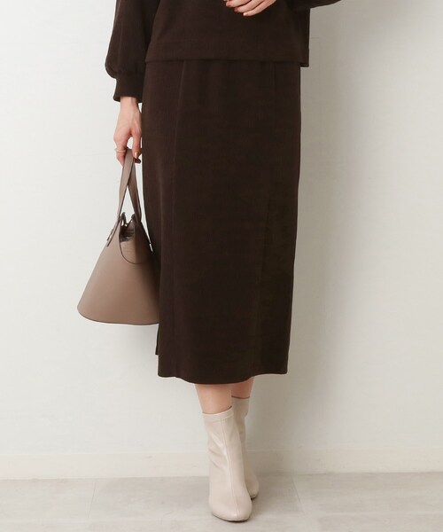 凹凸感がある素材が可愛いナロースカート!【デザイン】シンプルながら素材が特徴的なので、オシャレのワンポイントにピッタリなアイテムです!細身のシルエットながら素材がカットソーなので、伸縮性もあり穿きやすい1枚に仕上がっています。同じ素材を使用したプルオーバーとセットアップとしての着用もトレンドでオススメです。(セットアップ品番:256-15030)※ポケットなし【素材】ベロア風な素材に凹凸感が生まれた新しい素材を使用したスカートになっています。※膝丈部分のみ裏地あり#CutieBlonde#Cutie#cutieblonde#cutie#キューティブロンド#キューティ#20代#30代モデル情報:身長168cm B76 W58 H86 着用サイズ:02(M)店舗へのお問い合わせ商品番号:256-75009●製品寸法:02(M):W60~76cm H80cm 総丈81cm03(L):W66~82cm H86cm 総丈82cm備考: