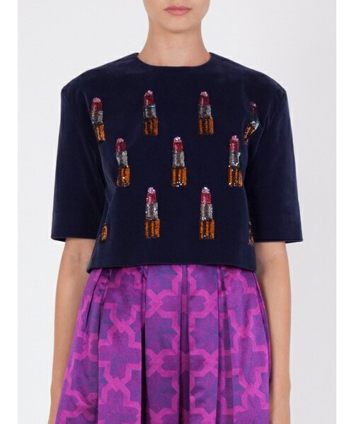 +DETAILS Boxy, cropped navy velvet top with shimmering sequin lipstick embellishment. Soft, luxe velvet. Round neck. Short sleeves. Navy satin lining. Gold tone metal zip closure at back. - Navy multi. - 50% cotton, 50% polyester. Lining: 100% polyester.