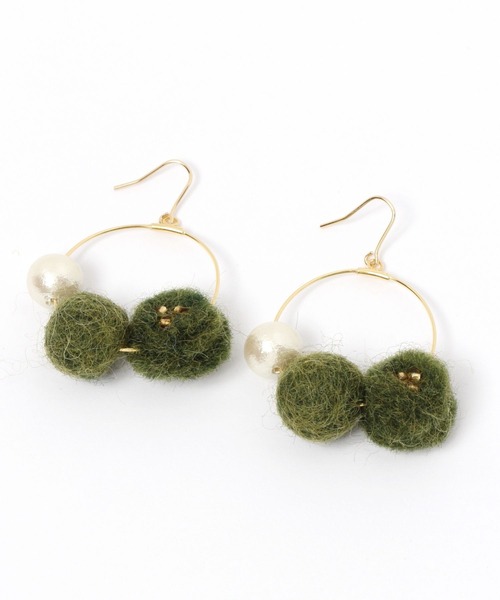 ーーーコットンパールと小さなフェルトパーツをリングに組み合わせたフックピアス。異素材のMIX感とワンポイントでコットンパールが付いているのがデザインポイント。ギフトにもおすすめのアイテムです。ーーー