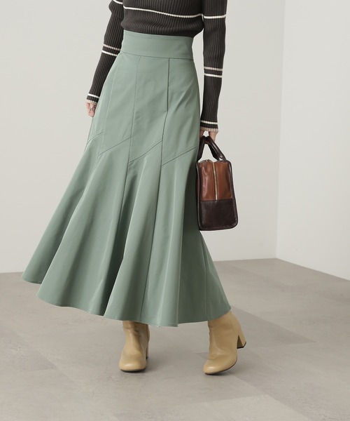 流れるようなシルエットが魅力のマーメイドスカート。お腹まわりをすっきりまとめ、縦ラインに切り替えをいれ、裾に向かってボリュームをだしたフレアーシルエット。立体感のあるマーメイドラインが、新鮮なコーディネートを叶えます。冬のコーディネートが重くならないようニュアンス感のあるカラー展開は、重厚感のあるブーツとも相性バツグンです。