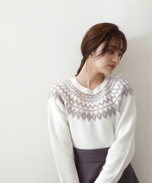 【商品特徴】ふわふわのフェザーとラメ糸を部分的につかったノルディックニットです。ウォーム感のある素材を使用、落ち着いたカラーのノルディック柄がシーズンライクな表情に。大きすぎないシルエットなのでコーディネートしやすい冬ニットです。【スタイリング】スカート合わせで大人かわいいコーディネートに。<商品のお気に入り登録>お気に入りアイテムの値下げ・再入荷・在庫1点などの通知を受け取ることができる便利機能ですので気に入ったアイテムはお気に入り登録がおすすめ!<ショップのお気に入り登録>新商品や再入荷、セール、クーポン配布などお得な情報を受け取ることができます。●撮影はサンプル商品で行っている為、仕様とサイズが異なる場合がございます。●スタジオ及び屋外で撮影した着用画像は、光の当たり具合で色味が違って見える場合があります。予めご了承ください。