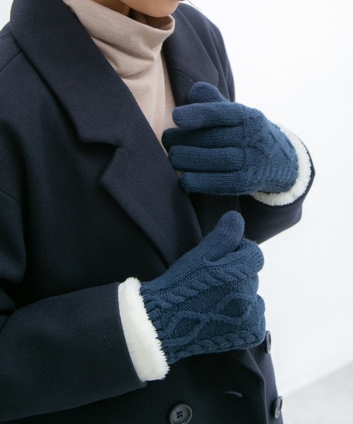 裏フリースであったか 【デザイン】 秋冬らしいケーブル編みデザイン。 手首部分はもこもこボア付きで、伸ばしても使える折り返しタイプ。 【素材・機能】 表地はあたたかみのあるニット素材。 手触りも防寒性もバッチリの内側フリース素材に、防臭効果のある『抗菌加工』と、汗などの水分を吸収して発熱しあたたかな『発熱加工』もプラスした優秀アイテム。 親指と人差し指の先に入れた導電糸で、着用したままスマホの操作が可能。 【スタイル】 通学やデイリーカジュアルに大活躍。 ※サイズにつきましては若干の誤差が生じる場合がございます。予めご了承ください。 ※湿度・摩擦により多少色落ちする可能性があります。 品番:241-160-8260
