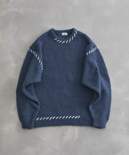 【トレンドビッグシルエット】ハンドステッチビッグクルーニット■素材、機能再生ポリエステルを使用し、あまめに編み立てることで柔らかくふっくらとした雰囲気に仕上げました。■シルエット、デザインゆとりのある身幅にドロップショルダーのトレンドシルエットになっており、太番の糸を使用した配色ハンドステッチがデザインのポイントになっています。■カラー定番のブラックに加えてブルーとミントはコーディネート映えするニュアンスカラーになっています。■スタイリングフレアパンツで合わせたメリハリあるコーディネートもおススメですが、オーバーサイズコートのレイヤードに合わせるのもおススメです。裏地:なし透け感:なし伸縮性:あり生地感・厚さ:普通ポケット:なしその他仕様:ハンドステッチ【モデル着用サイズ】MEN:身長177cm 着用サイズLWOMEN:身長164cm 着用サイズM※撮影場所やライティング、お使いのモニター環境によって色の見え方が異なる場合がございます。※画像の商品はサンプルです。 実際の商品と仕様、加工、サイズが異なる場合がございます。