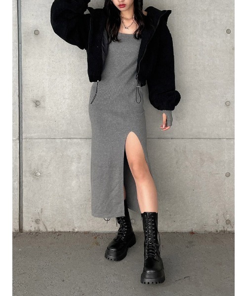 ディープスリットがポイントのロングワンピース。スクエアネックなので顔周りがスッキリ見え華奢見えを叶えてくれます。厚すぎない生地を使用している為アウターも羽織りやすいワンピースです。※フィンガーホール付きです。