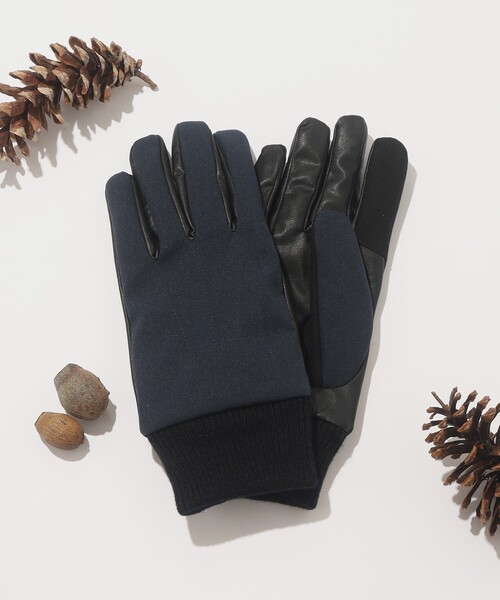 【素材】 柔らかな風合いのシンセティックレザーと、布帛生地を切り替えました。 ご自宅で洗えるのも嬉しいポイントです。 【デザイン】 異素材でMIXさせたデザインのグローブ。 手首部分をリブ編みニットで切り替えることで、フィット感を高めたアイテムです。 シンプルなルックスなので、オンオフ問わずお使い頂けます。 ※こちらの商品は、付けたままでもスマートフォンを操作して頂けます。機種により作動しない場合がございますので、予めご了承ください。 店舗へのお問い合わせ商品番号:979-05143 ●製品寸法: 00:全長27cm 幅8cm 備考: