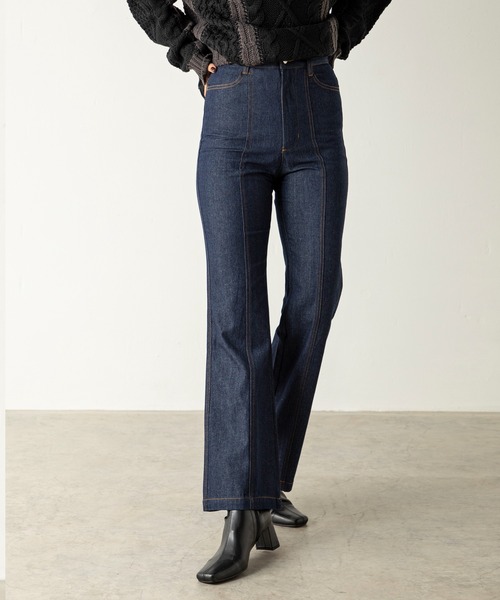 “待ってました!”な毎日着たくなる美シルエットデニムが登場 【デザイン】 セミフレアで美脚効果をもたらすデニムパンツ。着用するうちに馴染んでいくやわらかいデニム素材を使用し、スタンダードなインディゴブルーと大人なブラックの2色展開でシーズン問わず幅広く着回せます。 膝位置から裾に向かって広がるフレアデザインは美しいシルエットを描き、センターのダブルステッチで更に脚のラインをシャープに魅せます。 ニットと合わせたカジュアルスタイルにも、ブラウスと合わせた今年らしいマニッシュスタイルにもおすすめです。 【MODELサイズ】 ■ブラック | MODEL(メイン画像):身長 165cm / B 81cm / W58cm / H84cm ■ブルー | MODEL(メイン画像):身長 165cm / B 81cm / W58cm / H84cm 【MODEL着用サイズ】 Fサイズ