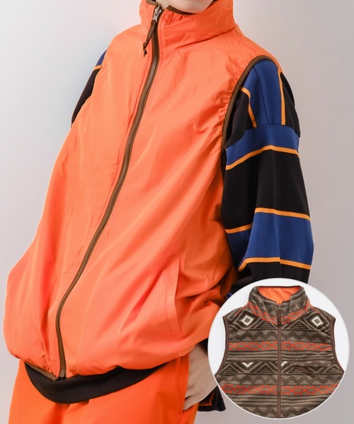 コーデに幅を持たせる一枚で二度おいしいリバーシブルベストをご紹介。●柔らかく肌触りバツグンのマイクロフリース素材●ゆったりとしたサイジングで厚手のアイテムとのレイヤード使いでも◎●フリース地側のポケットにはジップを装備しアウトドアなどのアクティブシーンでも活躍●使いやすいソリッド以外にも幾何学模様もご用意トレンドのルーズフィットでストリート、アウトドアや古着MIXスタイルにぴったりな一枚。肌触り日の羽織りとしてはもちろん、真冬にはヘビーアウターのインナーや部屋着使いにと大活躍間違いなし。男性はもちろん、メンズライクな女性にも着ていただきたいユニセックスな仕上がりとなりました。