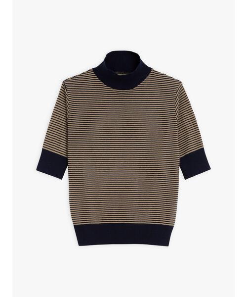 コットン糸とラメ糸でボーダーに仕上げた、半袖のハイネックプルオーバー。ラメがさりげなく存在感のあるアイテムです。綿混素材でさらりと着心地良く、長い季節で愛用して頂けます。ネック部分と袖口のリブがすっきりとしたシルエットに見せてくれます。ボトムスを選ばない万能アイテムです。※染料特性から、洗濯のくり返しにより型崩れしやすく、変色したり色落ちすることがありますので、ドライクリーニングをお勧めします。 (##)2(M):肩幅34、バスト88、袖丈28、ゆき丈-、着丈-、身丈533(L):肩幅37.5、バスト94、袖丈28、ゆき丈-、着丈-、身丈571(S):肩幅33.5、バスト84、袖丈28、ゆき丈-、着丈-、身丈53