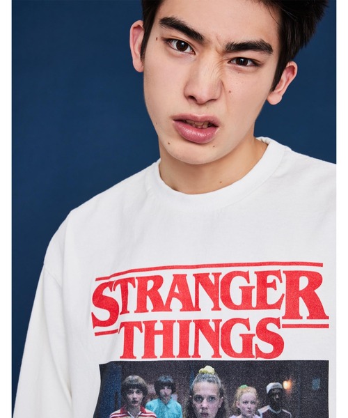 "STRANGER THINGS"とのコラボレーションアイテム ・3色展開 ・オリジナルピスネーム付き ・フロントはフォトプリント ・袖はラバープリント