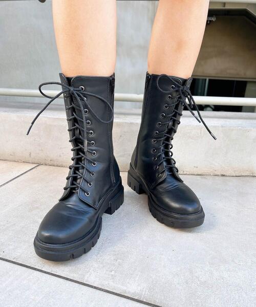 2022 AW 秋冬アイテム足元にボリューミーなアクセントをプラスするタンクソールのレースアップブーツはトレンドスタイルに欠かせない一足。足首をすっきりと見せるスレンダーなシルエットと厚底のソールでスタイルアップも狙えます。ボリュームがありながらも軽いので普段使いにぴったり。内側にはファスナーが付いているので紐を解かずに脱ぎ履きでき楽ちんです。安定感があるので長時間歩いても疲れにくいのも◎。・重量:約470g(片足Lサイズ)Mサイズ(23~23.5cm)Lサイズ(24~24.5cm)