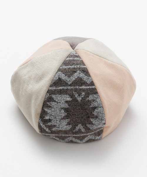 旅人をイメージしたデザイン。ジオメトリック柄の織り生地と無地のコントラストが個性的なパッチワークのベレー帽。合成皮革のパイピングがアクセント。コーデにプラスするだけで、モダンで洗練された印象に◎・サイズ調節紐付き。 ※こちらの商品は1点1点職人による手作りとなります。その為、生地の取り方により柄の配置や形・色合いなど若干異なる場合がございます。(画像は一例です。)あらかじめご了承ください。 Amina Collection Co.,LTD.