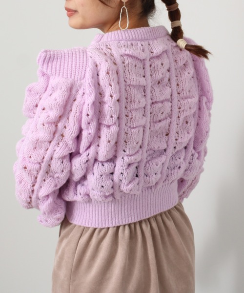 ポコポコと表情感のあるショート丈ニット☆【Design】ポコポコと凹凸感のある編み方がポイントのクロップド丈のチャンキーニット。袖口と裾はリブ編み仕様でフィット感のあるディテールにしました。肩にはパットを入れてパワーショルダーに仕上げています。ネックラインは冬場に嬉しいモックネック風にして首元が寒くならない温かいネックラインになっています。【Fabric】軽くて柔らかいニットを仕様。ニット素材のため、伸縮性が有ります。目が粗いざっくりした編み方なのでインナー着用をおススメします。肩パットが付いているため、インナーは肩パットと色を合わせていただけると目立ちにくいです。【Color】スモーキーな寒色系の3色展開・オフ(アイボリー 白色)・ピンク(パープル 桃色)・ブルー(青色)【Coordinate】丈の短いクロップドニットなので、ハイウエストのボトムスやロング丈のインナーとの相性が◎スエード調のIラインシルエットのスカートとの組み合わせは大人っぽくスラリと見えてスタイルアップ効果も。肩が落ちないパワショル仕様なので、細身のボトムスとのバランスも良く、スエードの表面感とニットの暖かさを感じるシーズンライクなコーデです。他にも、ロング丈のインナーを中にきてのパンツルックはショート丈が苦手な人でも挑戦できるシンプルコーデです。丈は長すぎないチュニック丈がこなれ感のあるコーデになっておススメです。toucher du brise(トゥシェドブリス)ガーリーなテイストを取入れて上品で可愛い、ほど良くエッジの効いたアイテムをベースにトレンドをミックスし、大人女性の等身大のスタイルを提案します。《お気に入り登録》でお得な情報がいっぱい・「商品のお気に入り登録」で再入荷通知や、人気アイテムのラスト1点通知、セール通知も受け取ることができます。・「ブランドのお気に入り登録」でレディース新作アイテムや再入荷など、お得な情報を受け取ることができます!