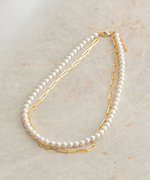【お顔周りに華やかさをプラスする、パールxチェーンネックレス】 パール×チェーンの組み合わせが、存在感を放つネックレス。チェーンを施す事で甘くなりすぎず、大人な印象に仕上げました。程良い長さが、幅広いトップスと好相性◎スタイリングによって表情を変え、身に着けるだけで今年らしいスタイルに。 ※商品画像は、光の当たり具合やパソコンなどの閲覧環境により、実際の色味と異なって見える場合がございます。予めご了承ください。 ※商品の色味の目安は、商品単体の画像をご参照ください。。