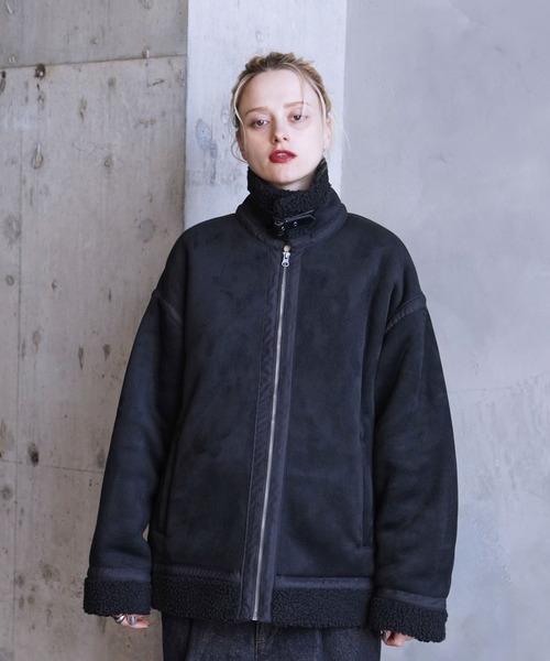 【ボア素材のボリュームアウター】ボンバージャケット ■素材 表面がスウェードで裏面は毛足が長くボリューム感のあるボア素材を使用しています。 ■デザイン・シルエット 襟は裏側にチンストラップがついているので、スタンドカラーにしてベルトを留めるような着用方法も可能になっています。 襟や袖先、裾はボアが表から見える切替デザインがアクセントになっていてボリューム感のあるデザインになっています。 シルエットは大きめのシルエットになっていますが、ボアで内側のボリュームがある分、着心地は見た目に比べて少し小さめに感じると思います。 デザイン的にユニセックスで着用しやすいデザインになっています。 ■カラー ブラックとブラウンの2色展開です。 ■スタイリング スタンダードにデニムやカラーパンツ系と相性が良いです。 キレイめなスタイリングならタートルネックをインナーなどに入れたシンプルなスタイリングがオススメです。 裏地:なし 透け感:なし 伸縮性:なし 生地感・厚さ:厚め ポケット:有り その他仕様:なし 【モデル着用サイズ】 MEN:身長177cm 着用サイズL WOMEN:身長175cm 着用サイズL ※撮影場所やライティング、お使いのモニター環境によって色の見え方が異なる場合がございます。 ※画像の商品はサンプルです。 実際の商品と仕様、加工、サイズが異なる場合がございます。