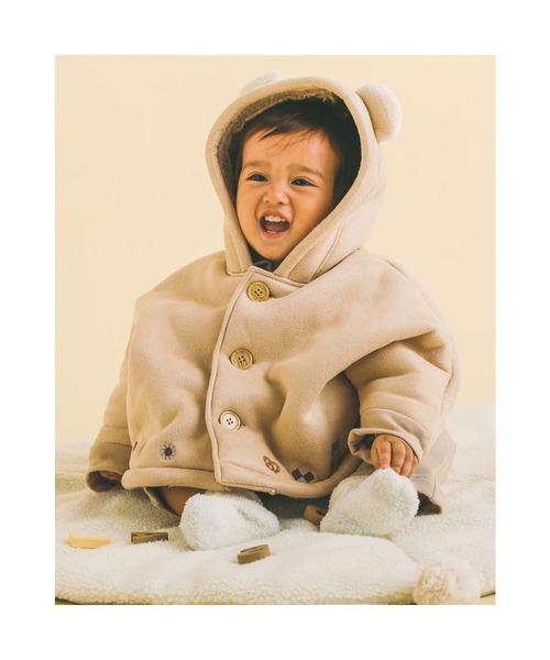 フードに付けたくまさんモチーフのお耳がかわいいベビー用マント。 お耳はファー素材を用いて、立体感をプラス。 裾には、おいしそうなお菓子やくまさんの刺繍を施しました。 フロントにポンポンっとウッド調のボタンをつけて、ナチュラルな雰囲気のマントに仕上がりました。 内側にはボア素材を使用して、真冬もあったかい◎ ふわふわなボアが優しくベビーを包みます。 お袖を折り返してもポイントになってかわいいです。 マントタイプの羽織は、抱っこ紐に入れたままうえからバサッと着せられてらくちん! ワンサイズ(50-90cm)展開で生まれたてから2歳ころまで長くご着用いただけるので、サイズに迷うベビーギフトにもおすすめです◎ ナチュラルな印象のベージュと、冬らしいブルーの2色展開です。 ベージュは女の子も着用いただけるデザイン♪ ※左上前開きです。 2022年秋冬男の子・女の子アイテム。 【SLAP SLIP(スラップ スリップ)】 ~子どもの欲しいをカタチに~ ヨーロッパのこどものように 子どもらしい今しか着れないナチュラルなかわいさを提案 どこか上品で清楚感漂うフレンチカジュアルは いつものコーディネートをさりげなく格上げ 洗濯:洗濯機使用可 裏地有りです。