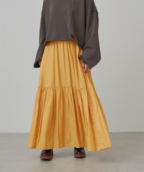 ■アイテム品を感じる光沢感のある生地とフェミニンな雰囲気のギャザーデティールを併せ持つスカート。揺れ感を演出しつつ、レーヨン混素材を使用することでしっとりと落ち感のあるひと品です。ウエストは総ゴムでリラックス感のある穿き心地。コーディネートのスパイスになるイエロー、こっくりとした温かみのあるブラウン、ベーシックで汎用性の高いブラックの3色をご用意。■素材・洗濯表示素材表地:レーヨン61% ポリエステル39%裏地:ポリエステル92% ポリウレタン8%洗濯表示:手洗い可《FRIPIER/フリピエ》世界各国を巡り探し回った、ごちゃまぜだけど楽しい気持ちになる古着屋をめぐり、お気に入りの一枚を探す宝探し古い物と古い物をミックスさせ、また古い物に手を加え新たに生まれ変わらせるそんな古着屋が持つ、MIX感を大切にした洋服たちを展開します。※こちらの商品は余裕を持ったお届け予定日に設定しておりますが、お届け予定日は前後する可能性がございます。ご了承ください。《商品画像について》ご覧頂いている商品の写真につきましては、できるだけ実物の色に近くなるように努めておりますが お使いの環境(モニター、ブラウザ等)の違いにより、色の見え方が実物と若干異なる場合がございます。 予めご了承ください。 《予約商品について》・こちらの商品はサンプルでの撮影・計測となっております。実際の商品とは、商品の一部仕様が変更になる場合がございます。・サンプルの為、混率の詳細が確定しておりません。確定次第、記載いたします。・工場の生産の都合上、納期が変更になる場合がございます。発送日の前後についてはあらかじめご了承ください。・入荷状況により、お客様への発送が店頭販売より遅れる場合もございます。《ハートをタップして商品のお気に入り登録》登録カラーの商品の「残りわずか」「再入荷」「値下げ」通知を受け取ることができます。ブランドフォロー 新商品などの入荷情報、最新のニュースやお得な情報を受け取ることができます。