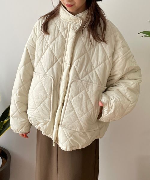 ーーー ■素材特性■ ナイロンタスランを使用して高密度に織りあげているので適度なハリ感があり、 しなやかな風合いが特徴の素材です。 ■デザイン■ トレンド感のあるショート中綿のジャケットです。 丈は短めですが、横にボリュームを取り、バランスを取りやすくしています。 キルティングにたっぷりと中綿を入れてぷっくりとした見え方になるようにこだわりました。 裾にドロストディティールを入れているので絞ってコロンとしたシルエットで着用しても可愛いです。 ボリュームのあるボトムとの相性が良いアウターです。 ーーー ■スタイリング例■ 少し短めの丈になっていますので、 今年はワイドパンツとのスタイリングがお勧めです。 フレアやハイウエストなどのスカートでも合わせやすいです。