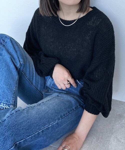 ターコイズ76はWEB限定カラー! ーーー モヘアのようなふんわりとした柔らかな素材感が特徴のニットトップス 綺麗なニュアンスカラーも魅力です。 片畦編みの身頃と総ケーブルのボリューム袖で、表情のある編み地に。 ーーー オーバーサイズながら短めの着丈なのでバランスが取りやすく、ボトムを選ばず着ていただけます。 重くなりがちな冬のコーデに新鮮さをプラスしてくれるオススメアイテムです。 〈注意事項〉 ・サンプルにて撮影をしておりますので、実際の商品とは素材や仕様・加工・サイズ等が若干異なる場合がございます。 ・モニター・環境等により実際の商品と色味が多少異なって表示される場合がございます。予めご了承をお願いいたします。 ・撮影環境により、光の当たり具合で色味が違って見える場合があります。あらかじめご了承下さい。