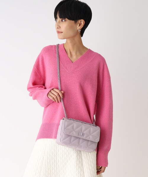 【GISELe 12月号掲載】 キルティング×チェーン使いが上品なミニショルダーバッグ。 【デザイン】 今シーズン注目のキルティングバッグは、シンプルなスタイリングに映える存在感のあるアイテム。 チェーンを1本持ちにすると斜め掛けでもお持ちいただけ、半分の長さにして肩掛けとスタイルを変える事が出来る2WAY仕様です。 持ちやすいコンパクトなサイズ感で、デイリーからちょっとしたお出かけまでスタイリングの幅が広いアイテム。 シンプルなニット×デニムのような、ベーシックな着こなしをクラスアップできるショルダーバッグです。 ※ポケット数:内側×1 【素材】 フェイクレザーにキルティング加工を施したミニショルダーです。 複雑なデザインのキルティングが目を惹き、チェーンハンドルやメタルパーツをすべて本体同色に揃えモードな印象にしています。 店舗へのお問い合わせ商品番号:C71-15057 ●製品寸法: 00:高さ14cm 幅(上部)21cm 幅(下部)18cm マチ8.5cm チェーン全長106cm 備考:重量:約305g