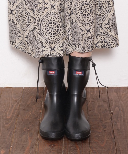 EDWINレインシューズシリーズより水を通さない防水ゴム素材のEDWIN のセミロングレインブーツが登場 【商品仕様】ロングタイプと同様に上品でシンプルなフォルムにブランドロゴマークがワンポイントになっています。 履き口部分は、紐で絞ってストッパーの位置を調整できる仕様なので、履き口からの浸水を防ぎます。 とても柔らかいゴム素材なので、長い筒を2つ折りにして、付属のバッグに収納することができます。 甲材は、テカテカしすぎないセミマット。滑らかで自然な光沢があります。甲材も靴底も柔らかく、しなやかに屈曲します。 中敷の表面生地は、サラッとした肌触りのよい合成繊維で、ムレにくいです。中敷き取り外し可能。 中敷きの下にもう一枚市販の中敷きを入れて調整もできる仕様です。 靴底はしっかりしたグリップの凸凹がある滑り止め仕様になっています。 【ご試着の感想インタビュー】 普段は23.5cmから24.0cmのサイズを選ぶことが多い方。 Mサイズ(23.5cm相当)でご試着 余裕のある幅に感じます。 柔らかいゴム見たいでよく伸びますけど、少し指の位置が目立ちます。 靴下が厚い時期はサイズは一つ大きい方が良いかもしれないですし、 底が薄いので中敷きを入れて履きたくなりそうです。 ※WEB限定デザインです。 ※照明の関係により、実際よりもやや明るく見える場合がございます。またお手元のパソコンなどの環境により、製品と画像のカラーが若干異なる場合もございます。予めご了承ください。