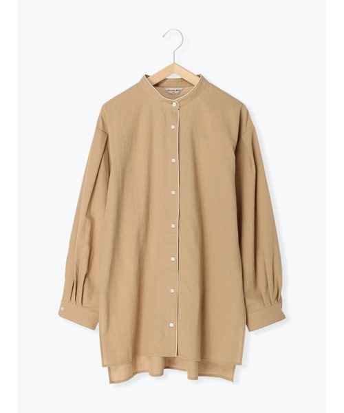 パイピングデザインがこなれ感のあるスタイリングに仕上げてくれるチュニック。袖口にタックを施し、立体的なシルエットを作り出します。バンドカラーは、顔周りをすっきりと見せてくれる効果も◎合わせるボトムス次第で雰囲気の変化を楽しむことができるアイテムです。※商品画像は、撮影環境やお客様のご利用のPC・スマートフォンのモニター環境などにより実物と色味に差異がある場合がございます。【その他採寸】F 着丈:[前]73cm[後]80cm