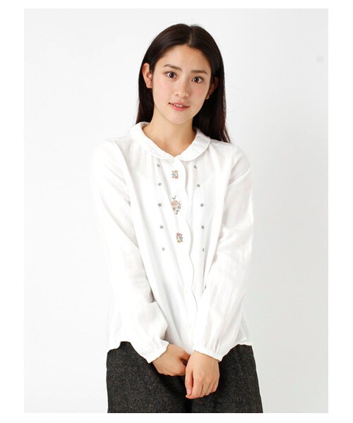 綿ビエラ起毛前立刺繍ブラウス。カントリー調に刺繍された小花柄がガーリーな印象のアイテム。フロント部分のスカラップ状の合わせ部分が可愛いポイントになります。【モデル身長:約162cm/着用サイズ:Mサイズ】